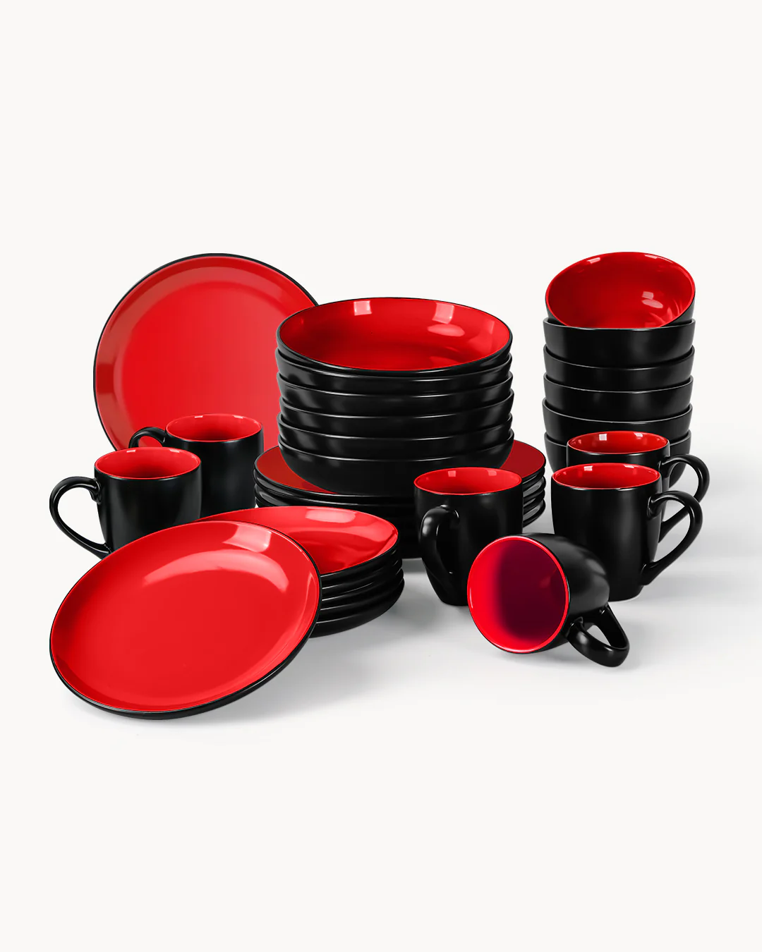 Es enthält 6 große Teller (Ø 26 cm), 6 kleine Teller (Ø 20 cm), 6 Schüsseln (740 ml) und 6 Tassen (350 ml) – perfekt für Frühstück, Mittag- oder Abendessen mit bis zu 6 Personen.