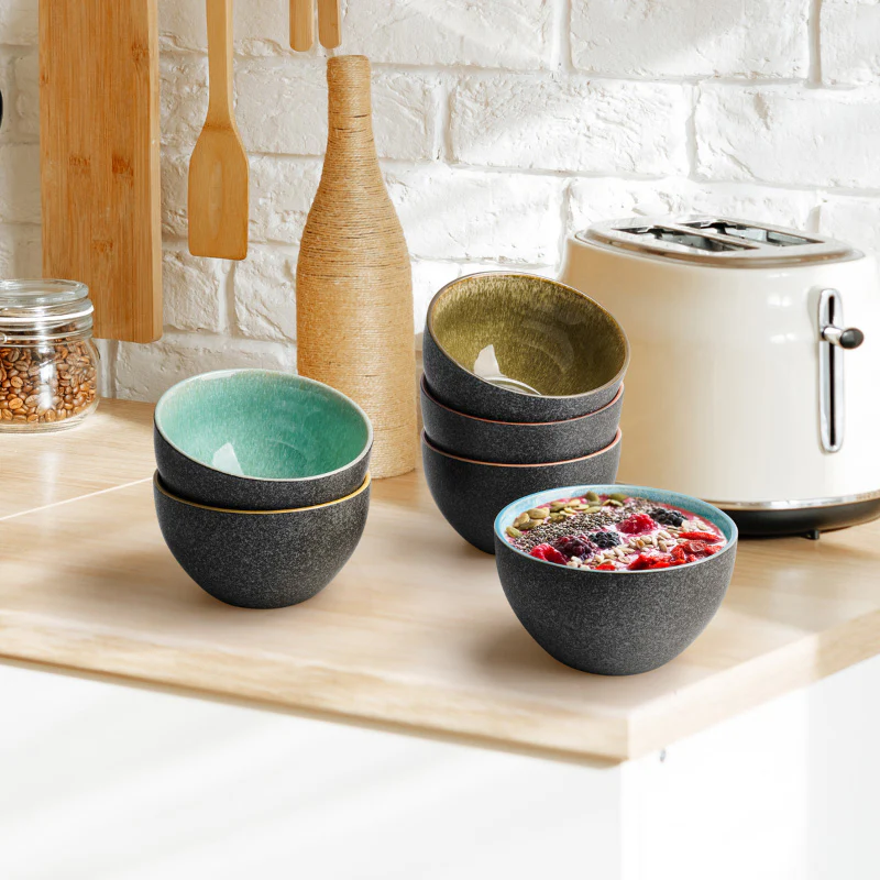 Das Las Palmitas Geschirrset (24-teilig für 6 Personen) verbindet farbenfrohes Design mit moderner Alltagstauglichkeit. Die Kombination aus der sanft matten Außenseite und den sechs leuchtenden Farben im Inneren macht jedes Teil zu einem kleinen Highlight auf dem Tisch. Das Geschirr Set besteht insgesamt aus 24 Teilen. Dazu gehören 6 kleine Teller, 6 große Teller, 6 Schüsseln, sowie 6 Tassen. Das Geschirr ist aus hochwertigem Steinzeug gefertigt und sowohl mikrowellengeeignet als auch spülmaschinenfest.